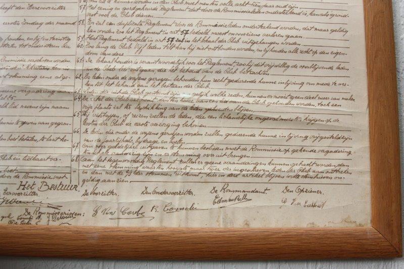 Het handgeschreven reglement uit 1932 in het zaaltje met het trapje op.